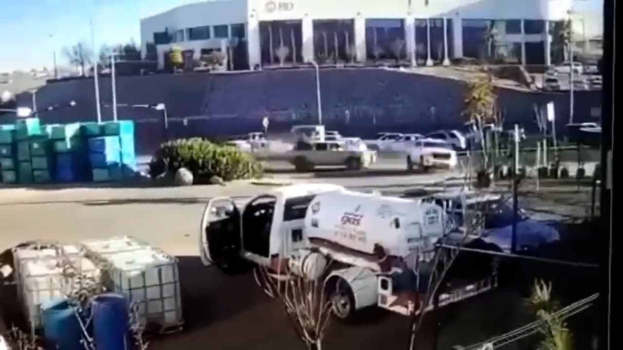 El video de una cámara de seguridad capta el momento en que varios presuntos sicarios escapan corriendo luego de que un vehículo militar impactara la camioneta en que pretendían escapar. Según las autoridades mexicanas, en la unidad de los sospechosos encontraron armas y municiones.