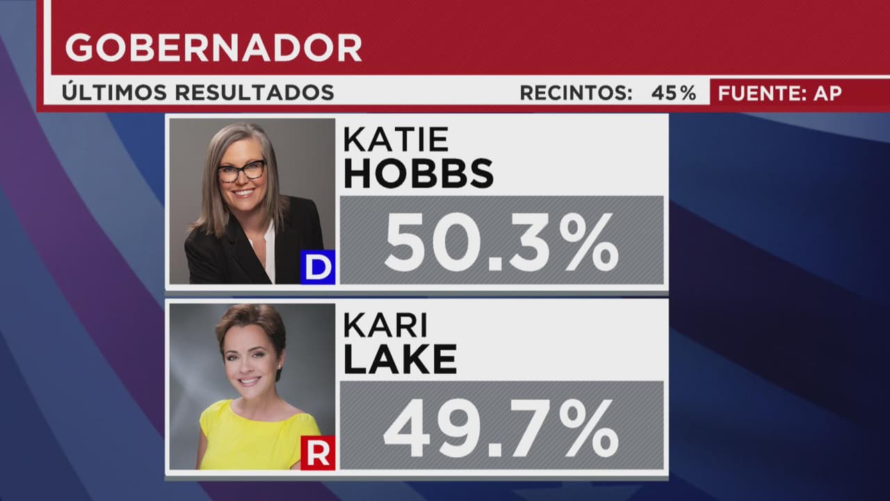 Los resultados preliminares hasta el momento en la contienda por la gobernatura en Arizona dan un 50.3 % de los votos a la demócrata Katie Hobbs mientras la republicana Kari Lake lleva el 49.7%.
