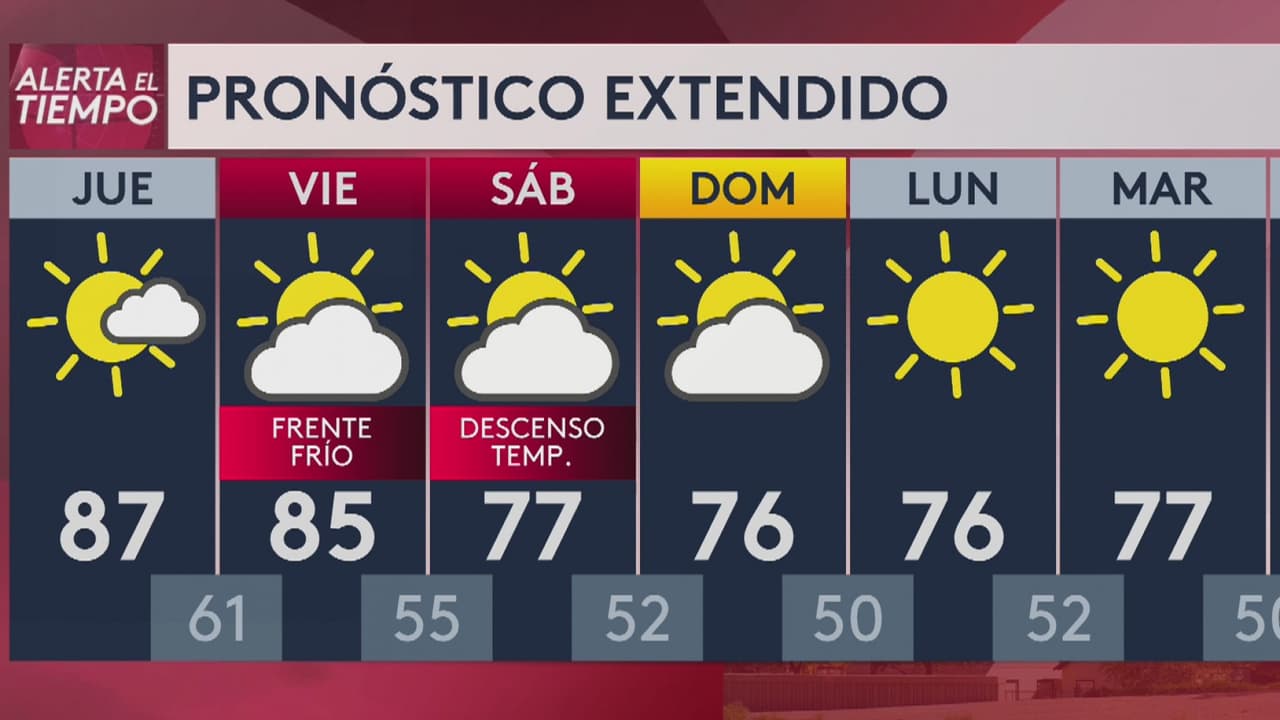 Para este jueves, en Phoenix y sus alrededores se esperan temperaturas máximas cerca de los 87 grados Fahrenheit y mínimas de 58 grados. Para la próxima semana, se esperan temperaturas por debajo de los 80 ºF. “Incluso cuando las temperaturas caen en los 70, se mantendrán por encima de lo normal”, indica el Servicio Meteorológico Nacional de Phoenix.