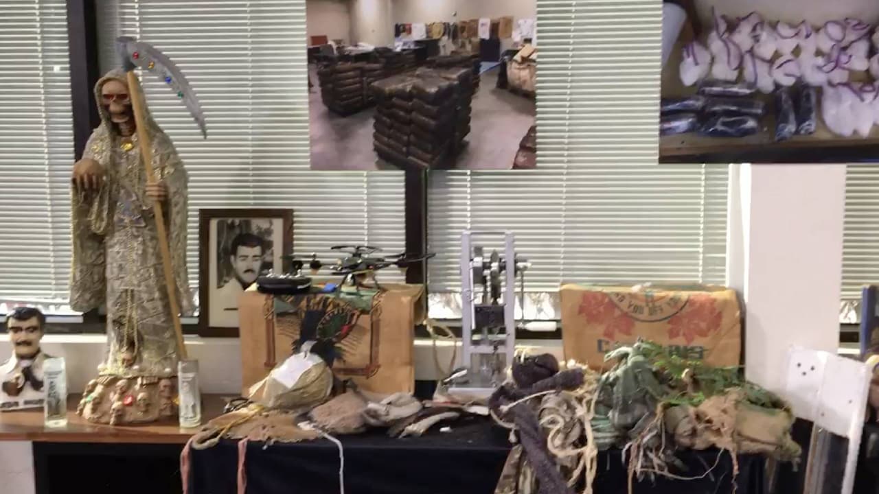 Entre el decomiso de drogas, autoridades confiscaron estatuas religiosas como La Santa Muerte y Jesús Malverde.