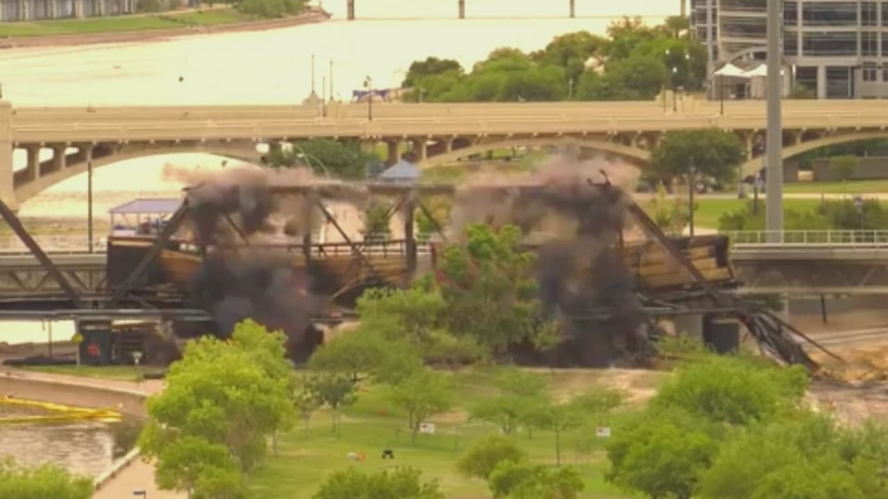 Una sección de 150 pies del puente fue detonada con éxito. La estructura había sido dañada en un incendio provocado por el descarrilamiento de un tren, cuya carga se incendió. Autoridades llaman a los residentes a evitar la zona mientras se realizan las reparaciones.