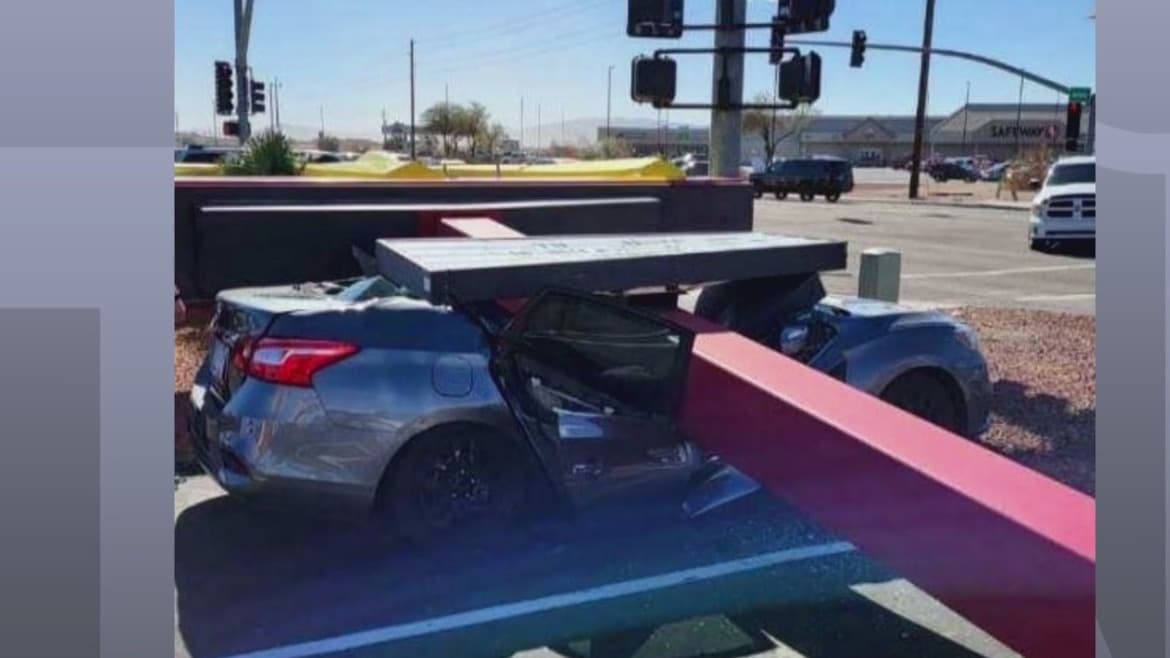Autoridades de Mohave mostraron las imágenes de un enorme letrero de McDonald 's que, debido a los fuertes vientos registrados en la zona, cayó sobre un automóvil. Por fortuna, el vehículo estaba vacío al momento del incidente.