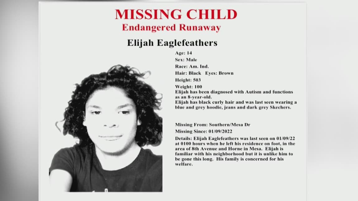 La policía de Mesa pide información sobre Elijah Eaglefeathers, un menor de 14 años con autismo que debido a su condición, actúa como un niño de 8 años. Se le vio por última vez al salir de casa en la madrugada del domingo.