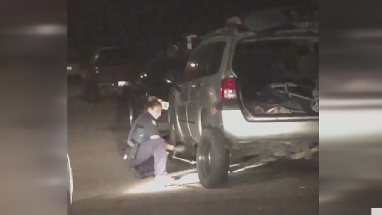 Captado en cámara: una oficial ayuda a mujer a cambiar la llanta de su auto