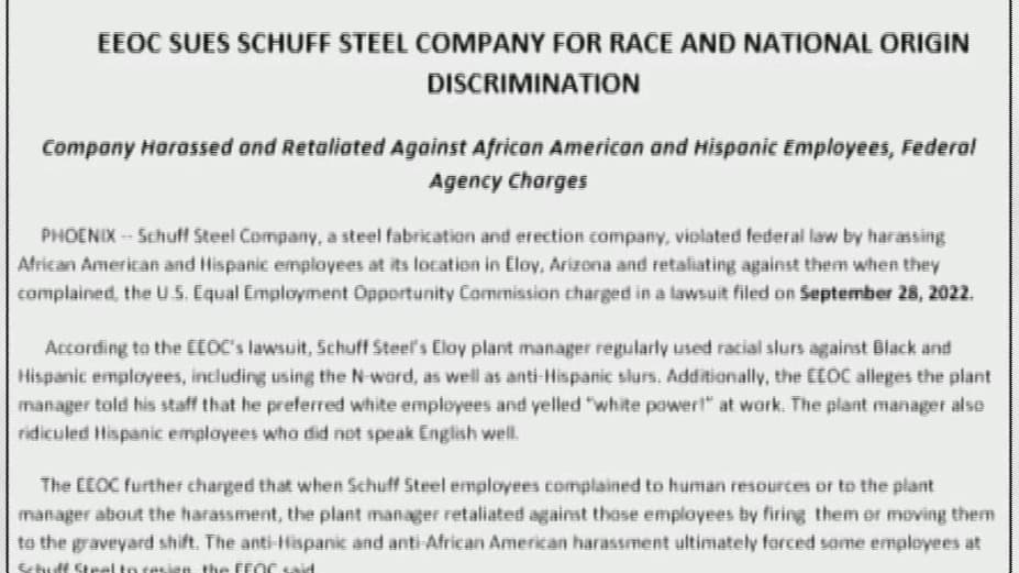 El gobierno federal demandó a una empresa de construcción y fabricación de acero, en su sede de Eloy, Arizona, por discriminación contra empleados hispanos y afroamericanos, además de acoso y represalias cuando los trabajadores se quejaron.