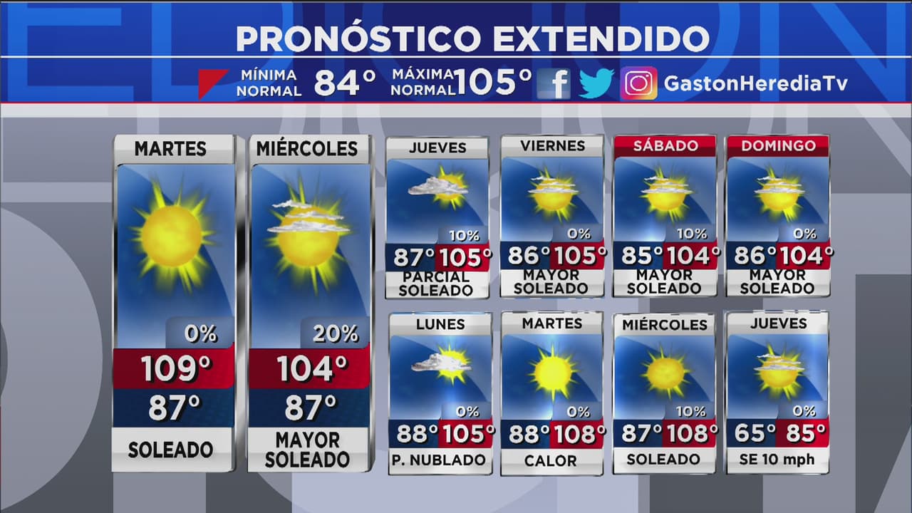 Espere temperaturas por arriba de los 110 grados con cielos totalmente despejados para este lunes y el resto de la semana.