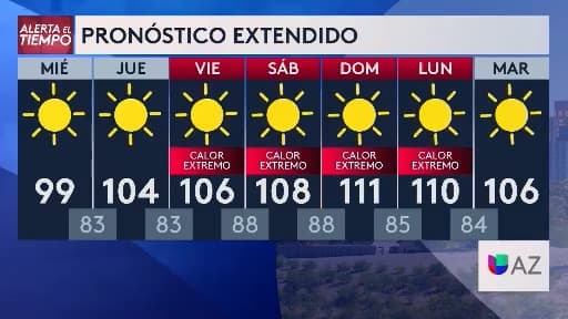 Para este miércoles el área metropolitana de Phoenix tendrá temperaturas máximas cerca de los 103 grados Fahrenheit y mínimas de 82 grados. “Las altas temperaturas volverán a 110° F y alcanzarán o romperán récords diarios de viernes a lunes”, indica el Servicio Meteorológico Nacional de Phoenix.
