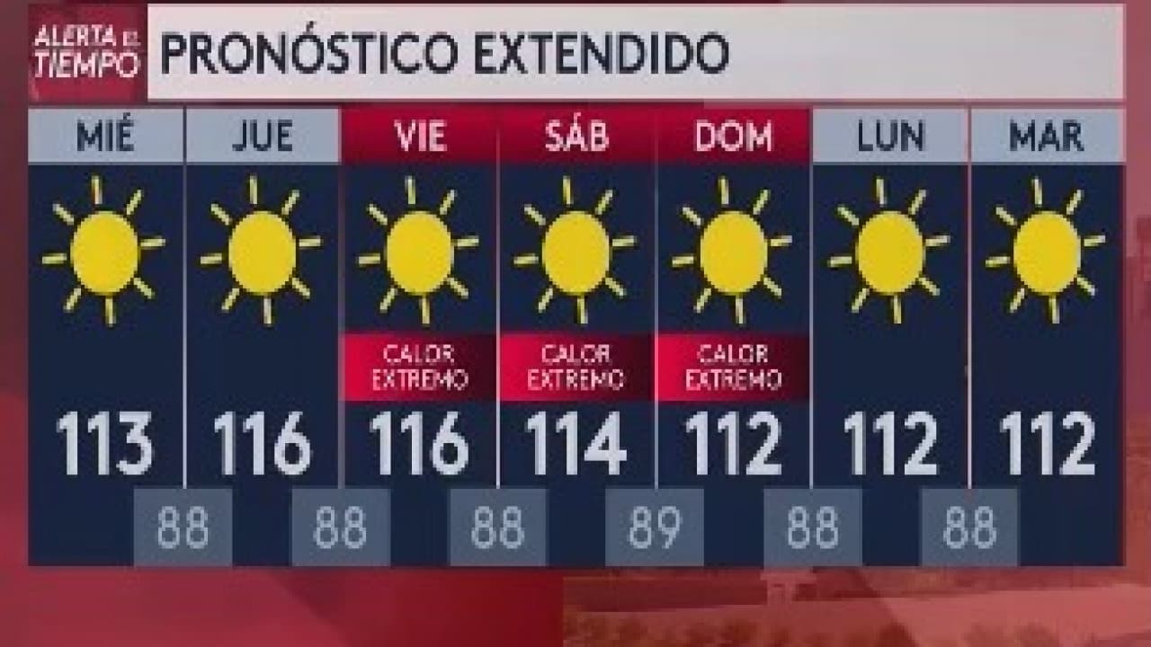En Phoenix y sus alrededores, se esperan que las temperaturas máximas llegarán a los 114 grados Fahrenheit y mínimas de 87 grados. De acuerdo con el Servicio Meteorológico Nacional de Phoenix que el día más caluroso de la semana podría ser este viernes con temperaturas alcanzando los 115 grados Fahrenheit.