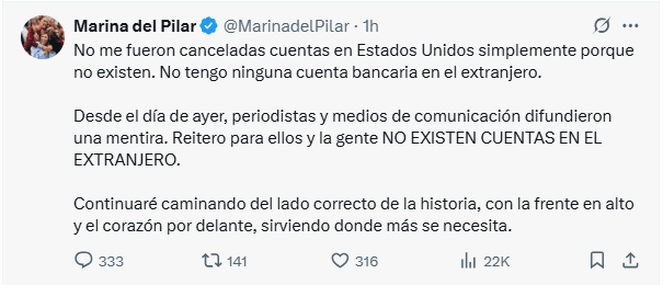 Marina del Pilar Ávila recurrió nuevamente a las redes sociales este martes para desmentir rumores sobre sus cuentas bancarias en Estados Unidos. La gobernadora de Baja California y su esposo están en el ojo del huracán por la revocación de sus visas estadounidenses.