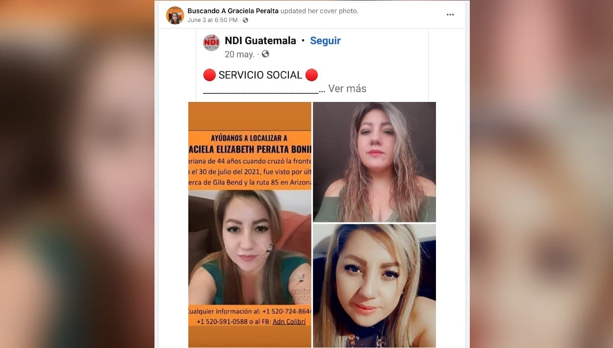 El 30 de julio de 2021, "le dijo a mi mamá que ya los iban a cruzar y ese fue el último día que supimos de ella. Luego no se volvió a comunicar pero sabemos que el teléfono seguía prendido porque le llegaban los mensajes. Una semana después se apagó", dijo a Univision Arizona Paola Peralta, hermana de Graciela, en entrevista por videollamada desde Ecuador.