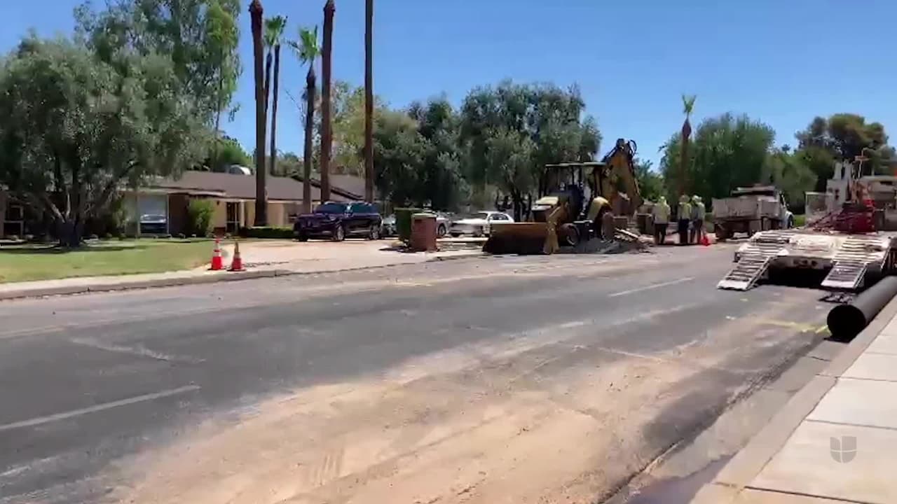 Equipos trabajan para reparar una calle en Phoenix luego de que un automóvil cayera este domingo en un hoyo lleno de agua. El incidente ocurrió cerca de 20th Street y Missouri Avenue.