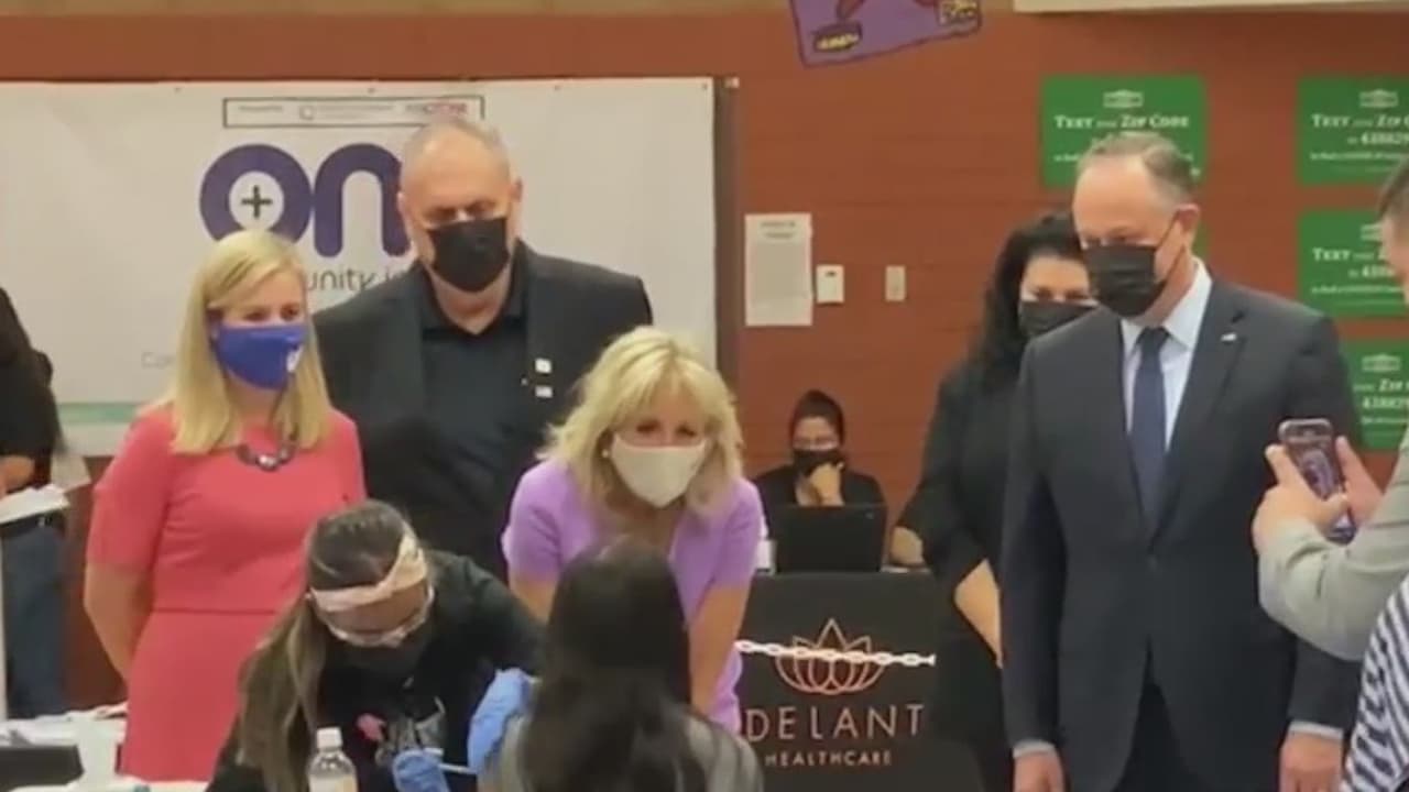 Jill Biden y Douglas Emhoff visitaron un centro de vacunación en Phoenix y junto a la alcaldesa Kate Gallego hablaron con los asistentes, algunos de ellos hispanos.