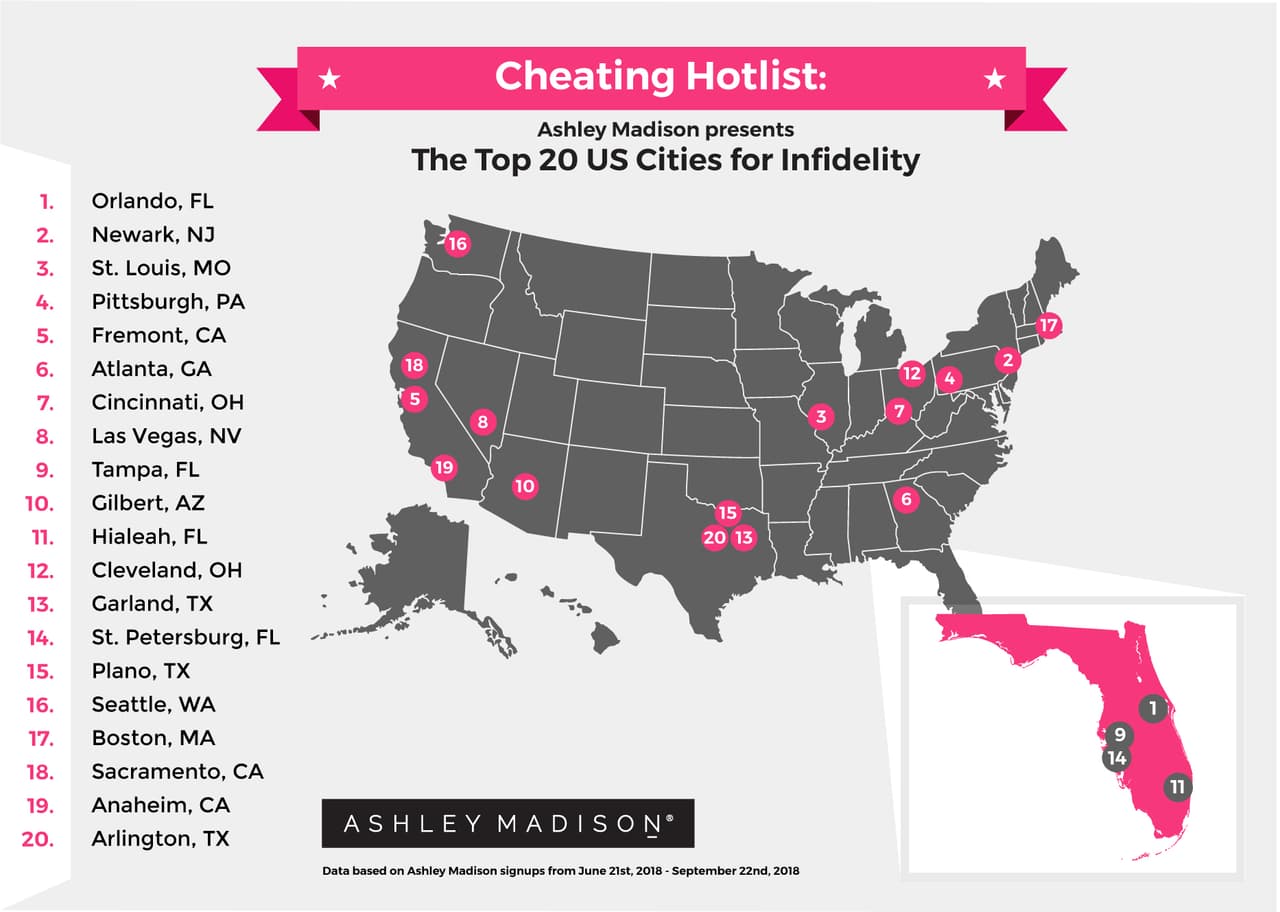 La lista analiza las inscripciones de cada ciudad en el verano del 2018 por cápita para determinar las ciudades más infieles de los Estados Unidos.
