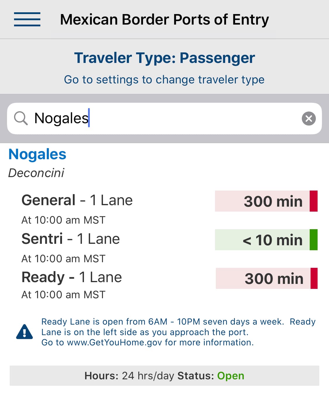 En la aplicación que tiene Aduanas y Protección Fronteriza (CBP) Wait Times para informar del tiempo de espera en los puertos de entrada de Canadá y México reporta que en las garitas de Nogales la espera es de 300 minutos y sale en rojo.