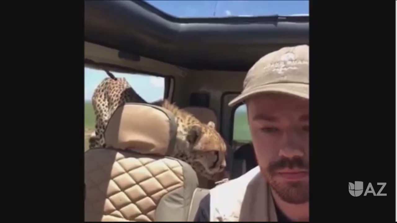 Los turistas al interior de un jeep quedaron sorprendidos cuando un leopardo decidió subir a su auto durante un paseo de safari en Tanzania.