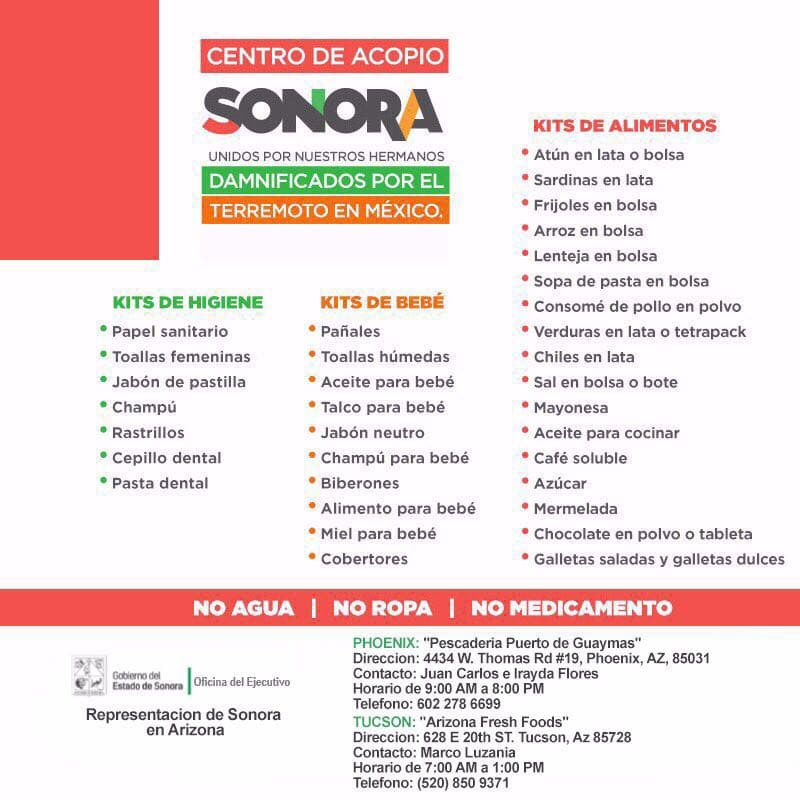 Abren centros de acopio en Arizona para damnificados por terremoto en México