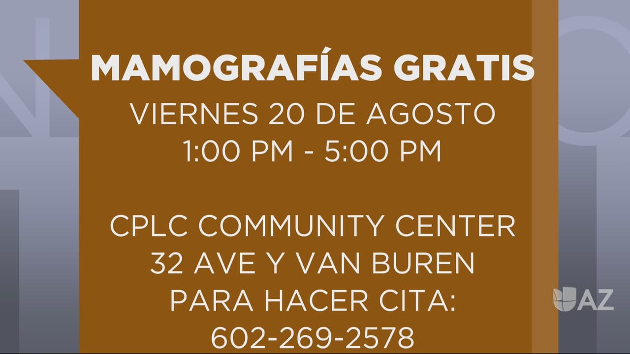 Este viernes se estarán realizando mamografías gratuitas en el centro de CPLC cerca de la Avenida 35 y Van Buren en Phoenix a partir de la una de la tarde. Para agendar una cita puede llamar al 602-269-2578.