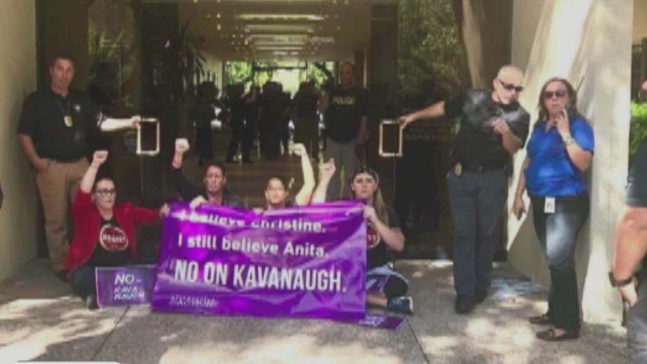 Manifestantes protestan afuera de la oficina de Jeff Flake para pedir que vote en contra de la confirmación de Brett Kavanaugh