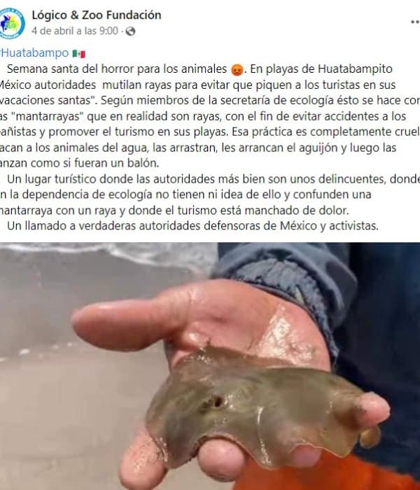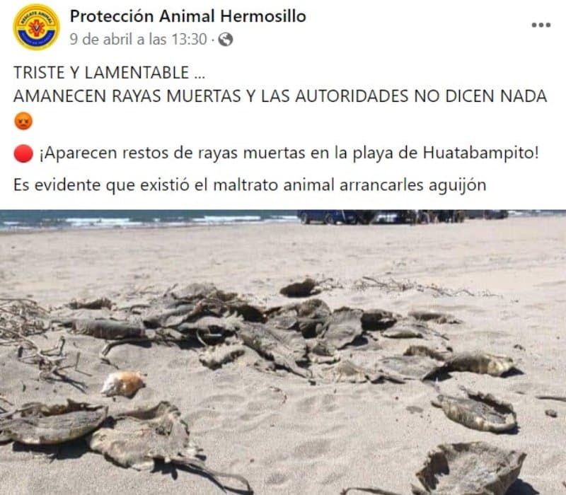 “¡Aparecen restos de rayas muertas en la playa de Huatabampito! Es evidente que existió el maltrato animal al arrancarles el aguijón”, se lee en la publicación en Facebook del grupo Protección Animal Hermosillo, con fecha 9 de abril.
