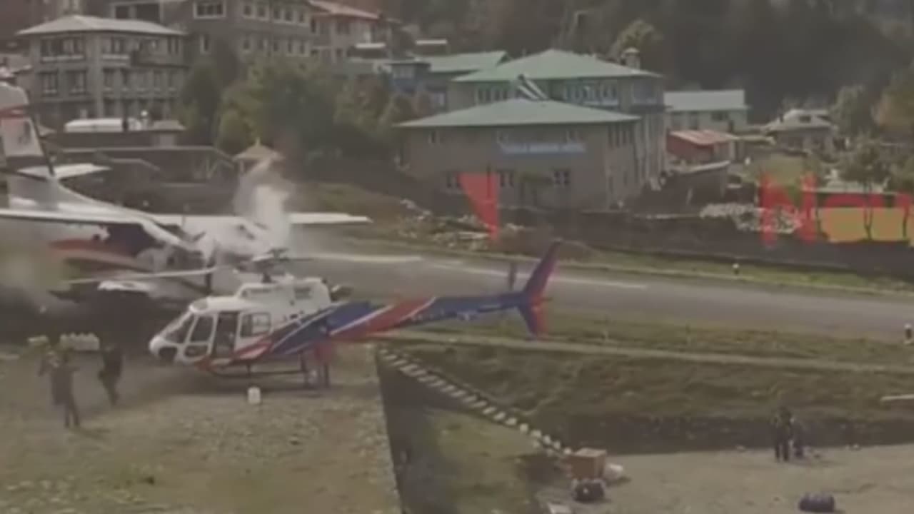 Momento insólito: un avión chocó contra un helicóptero en un aeropuerto de Nepal