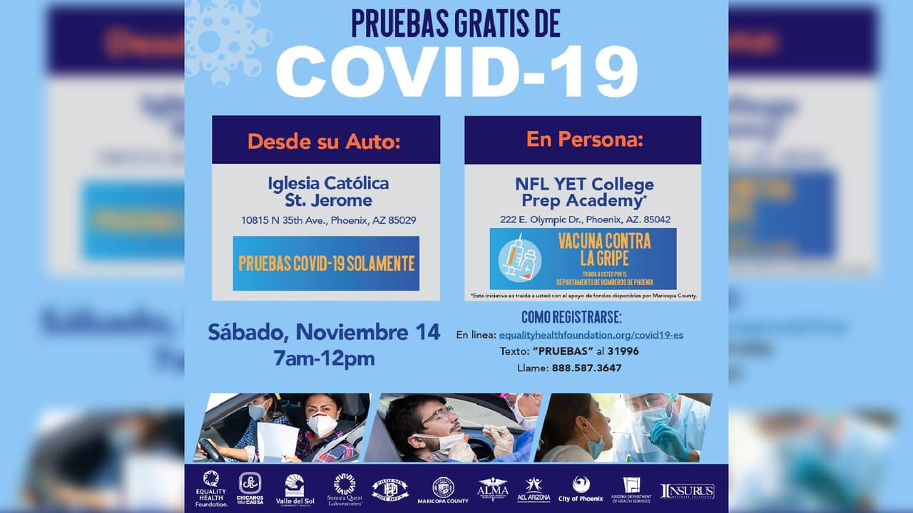 Funcionarios de Equalty Health también tendrán otro sitio de pruebas en Phoenix, y solamente estarán haciendo las pruebas de coronavirus (a diferencia del otro sitio donde hacen las pruebas y las vacunas). Las pruebas se realizarán 7 am a 12pm en la Iglesia Católica St. Jerome, ubicada en 10815 al norte de la Avenida 35 en Phoenix.