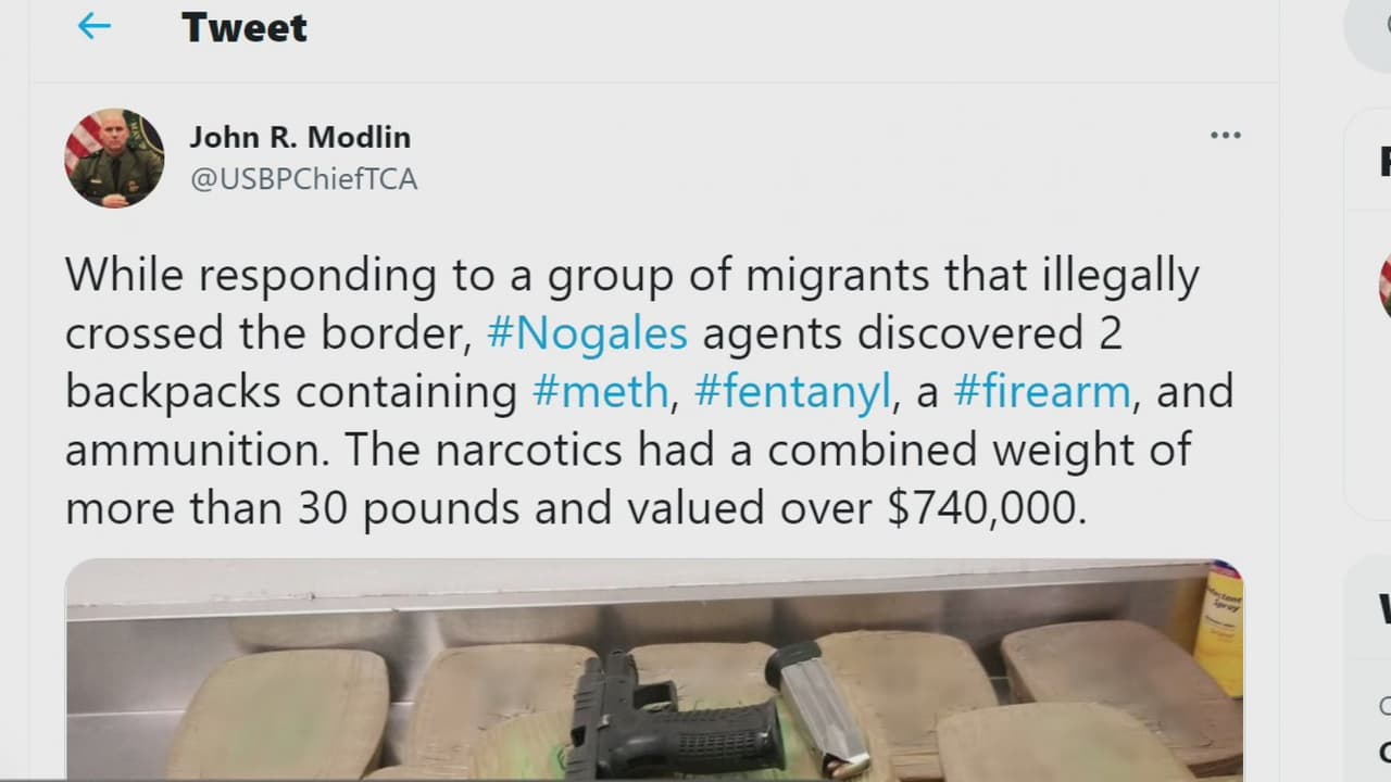 While responding to a group of migrants that illegally crossed the border, #Nogales agents discovered 2 backpacks containing #meth, #fentanyl, a #firearm, and ammunition. The narcotics had a combined weight of more than 30 pounds and valued over $740,000. pic.twitter.com/mSMclUEvFB