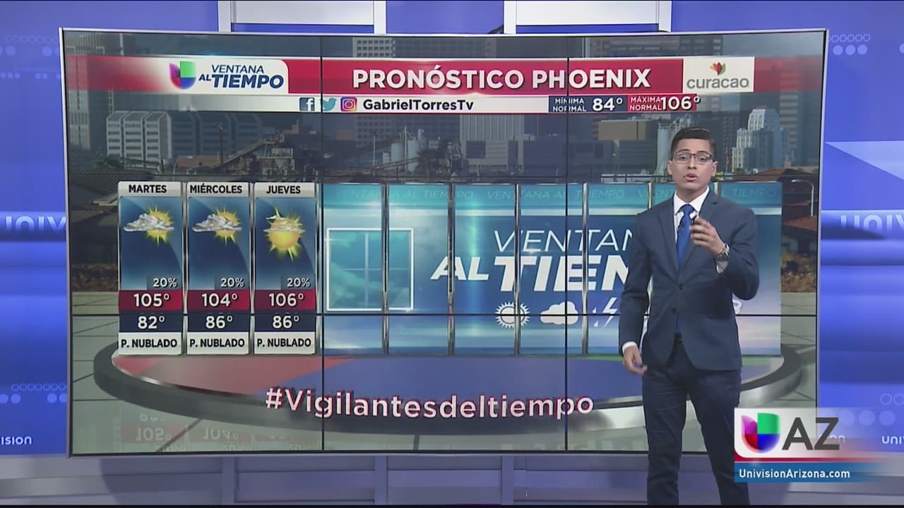 Un inicio de semana con un poco de nubosidad y con temperaturas por encima de los 100 grados, las posibilidades de lluvias se mantienen vigentes, las máximas para este martes en Phoenix serán de 105 grados. Manténgase bien hidratado.