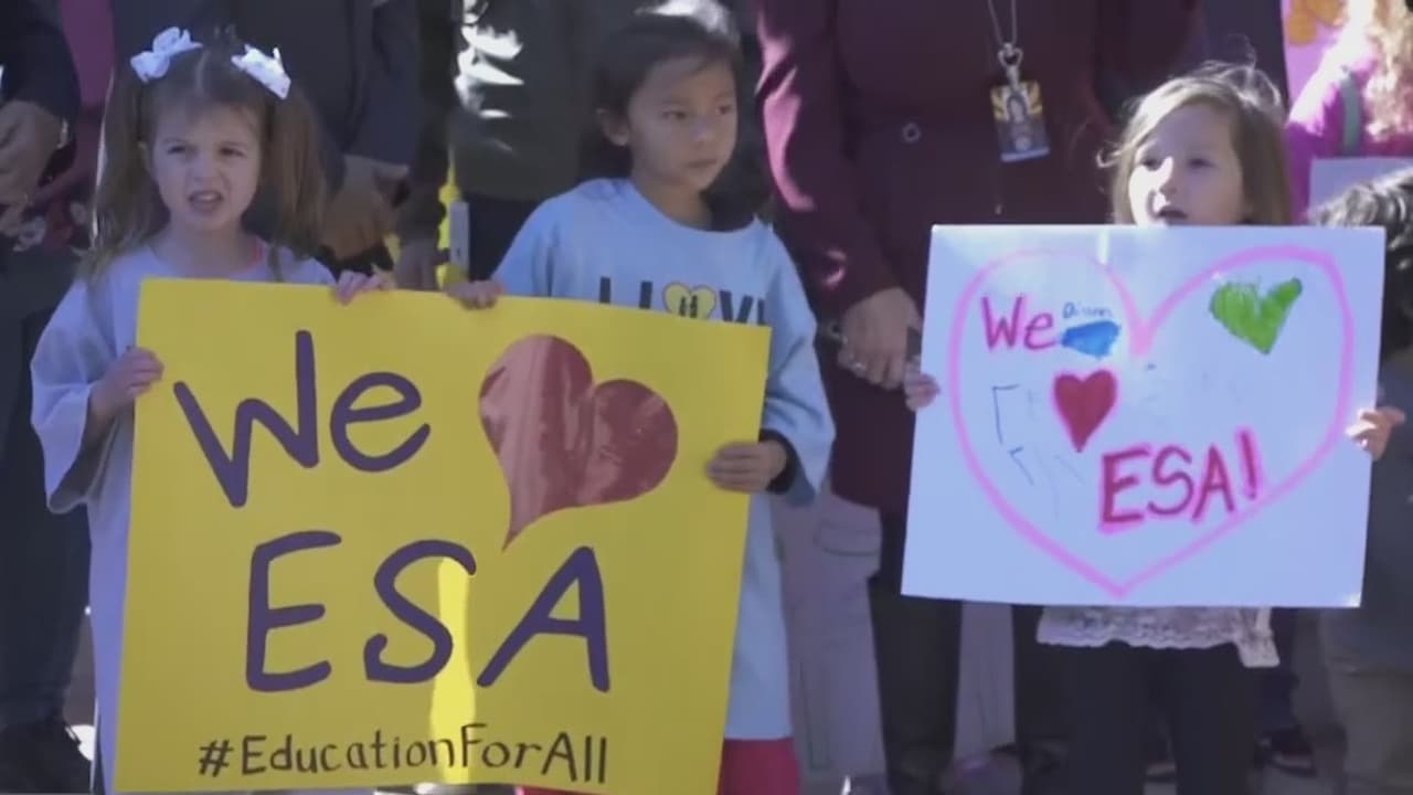 Video Manifestantes exigen mantener vales escolares para el presupuesto escolar de 2024 en Arizona