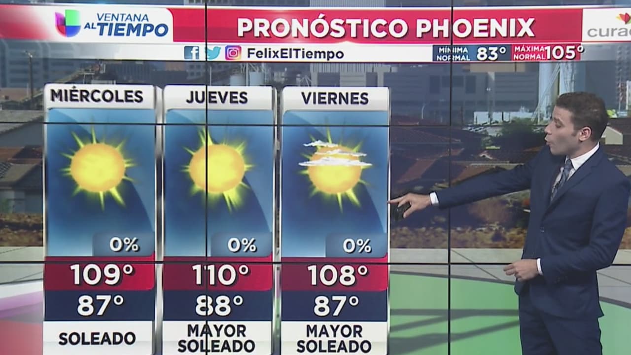Para este miércoles se prevén cielos despejados y condiciones secas, se espera que el termómetro alcance una máxima de 109 grados Fahrenheit, pero recuerde que la sensación térmica es mayor. Manténgase bien hidratado y evite actividades al aire libre.