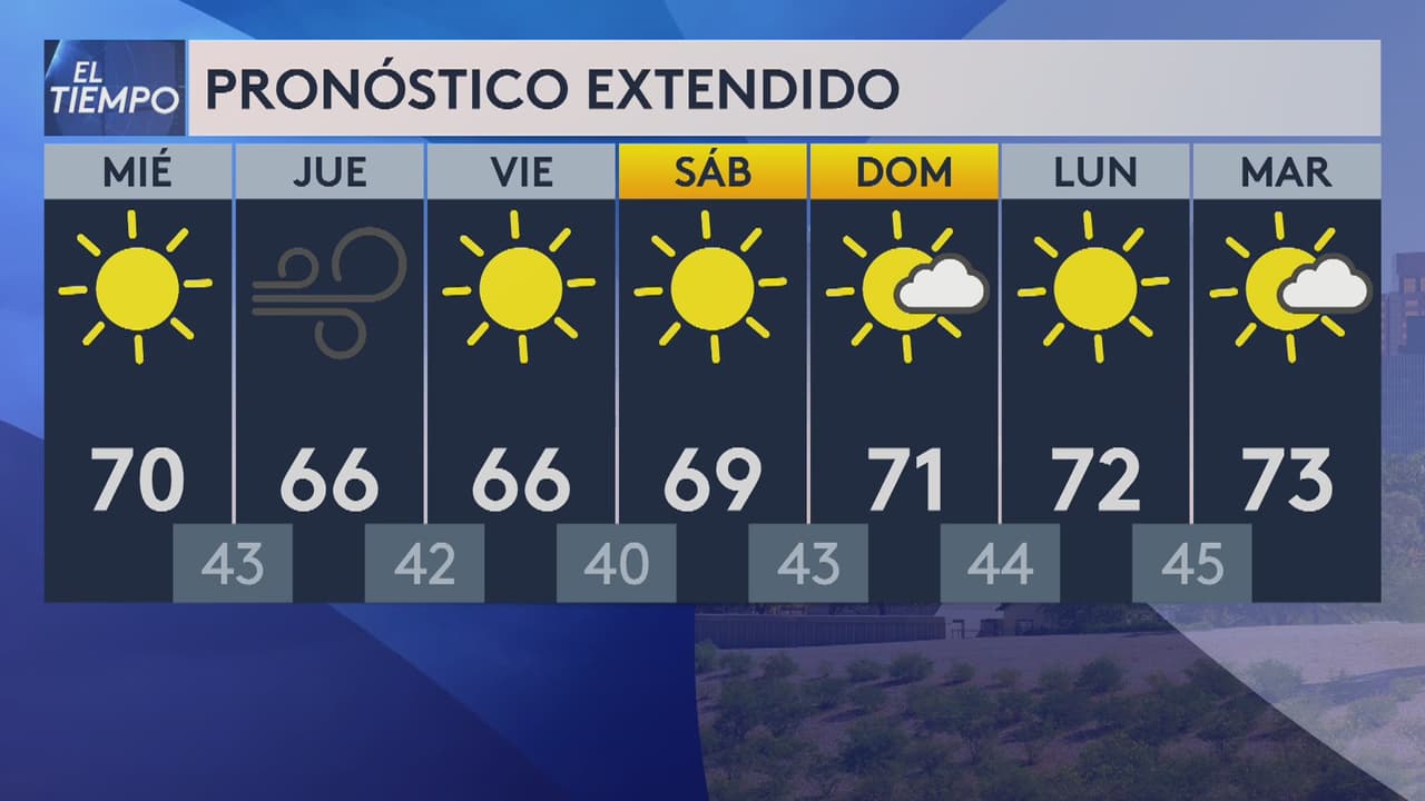 Para este miércoles, en Phoenix y sus alrededores se esperan temperaturas máximas cerca de los 70 grados Fahrenheit y mínimas de 41 grados. Es posible que se desarrollen fuertes vientos esta noche hasta el jueves por la mañana. Se prevén ráfagas de viento de hasta 30 mph al norte de Phoenix, según el Servicio Meteorológico Nacional.