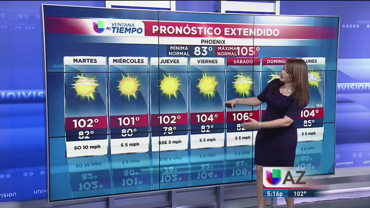 Un inicio de semana con altas temperaturas en la región, el termómetro marcó una máxima de 103 en Phoenix y 91 para Tucson. Posibilidad de tormentas hasta el fin de semana.