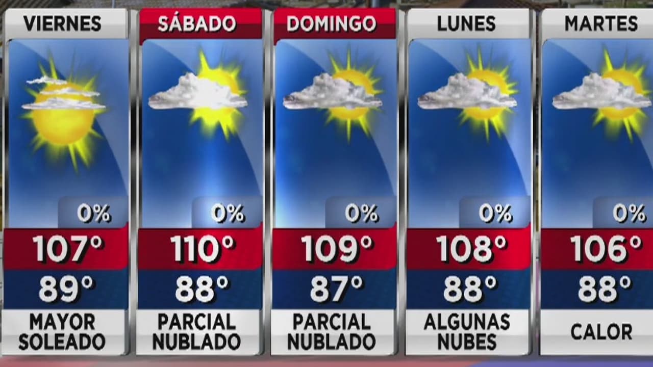 El aviso por mala calidad del aire persistirá hasta la noche del viernes, por lo que las personas con problemas respiratorios deben tomar precauciones. Las temperaturas máximas seguirán en el rango cercano a los 110 grados.