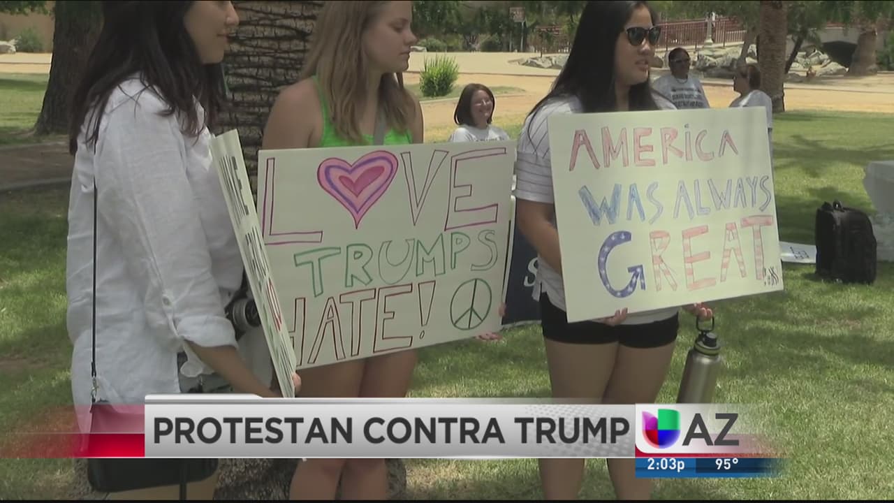 Un grupo de personas se reunieron en el Encanto Park para protestar por la llegada de Donald Trump. La policía vigila que no haya disturbios.