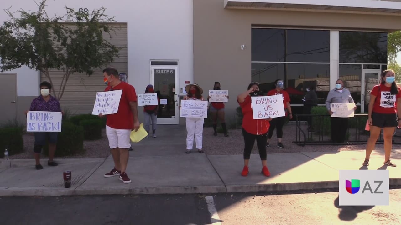 Un grupo de personas que fueron despedidas de la empresa HMS Host en el aeropuerto Sky Harbor a causa de la pandemia se reunió para manifestarse y exigir respuesta ante los despidos, además de apoyo ante su injustificado despido.