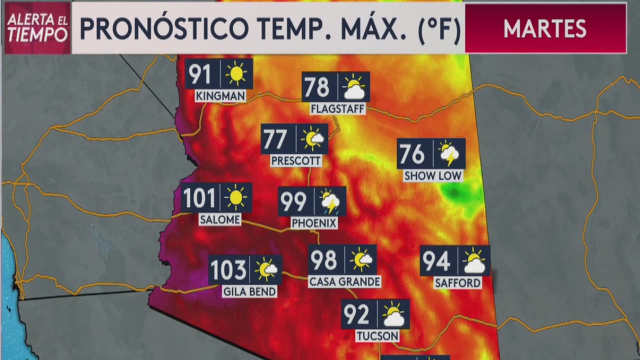 Al norte del estado, las temperaturas máximas llegarán a los 78 grados Fahrenheit y mínimas de 48 grados este martes. “Las mejores oportunidades de ver tormentas hoy serán en el este de Arizona. Algunos de estos podrían ser fuertes con fuertes vientos de más de 50 mph y granizo. Desde el miércoles hasta el fin de semana, el calor regresa con mínimas posibilidades de tormenta.”, indica el Servicio Meteorológico Nacional de Flagstaff.