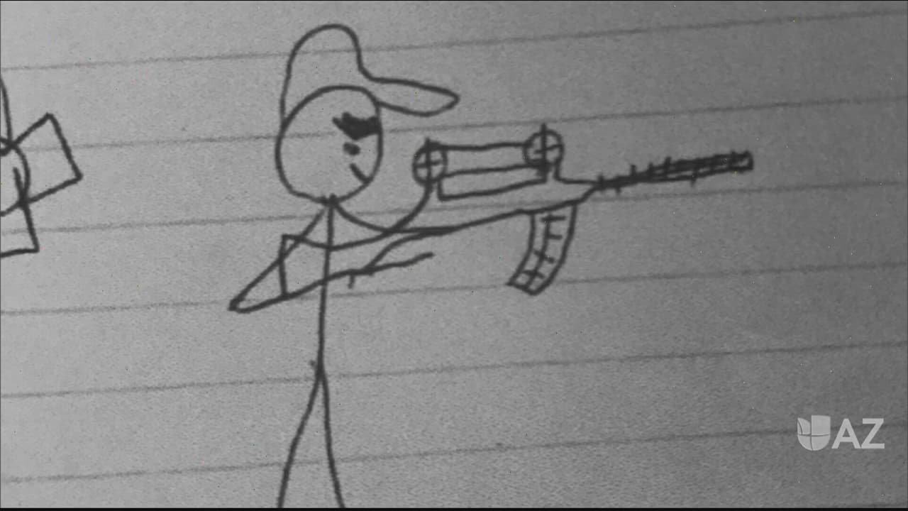 En los dibujos se muestran personas sosteniendo armas y cuchillos, el padre del menor argumentó que no está sorprendido; ya que ellos cazan animales. Sin embargo, el menor fue suspendido por dos días.