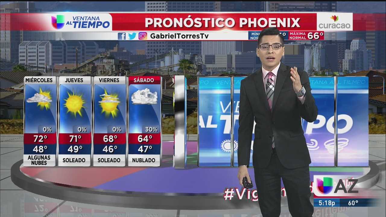 Posibilidad de ligeras precipitaciones en algunas zonas del estado, pero para Phoenix este miércoles se esperan temperaturas máximas de 72 grados y mínimas de 48. Para el fin de semana podrían regresar las lluvias.