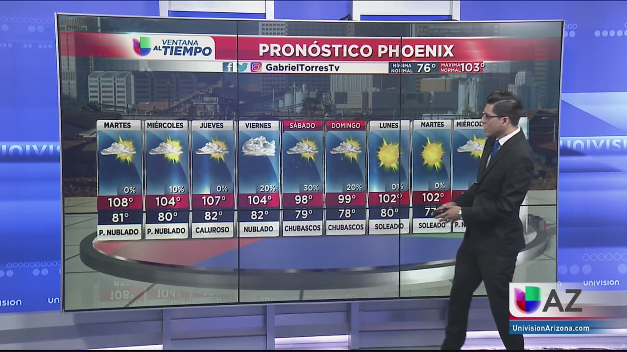 Un inicio de semana con temperaturas muy elevadas en el Valle, con máximas de 108 grados en Phoenix y 106 en Yuma. El aviso por calor extremo continuará vigente hasta el próximo miércoles. Manténgase hidratado.