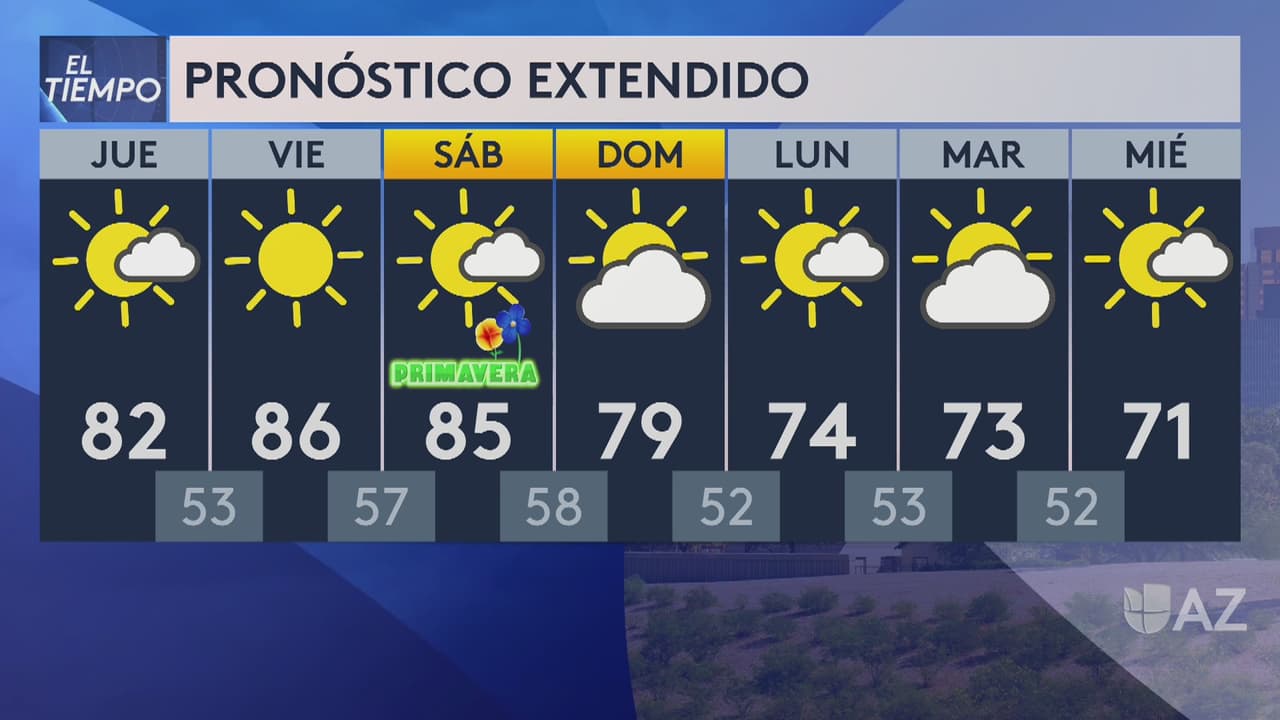 Mientras tanto, al norte de Arizona se tienen previsto temperaturas máximas lleguen a los 83 grados Fahrenheit y mínimas de 42 grados con cielos nublados.
