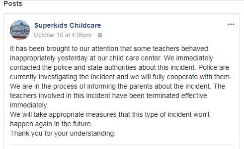 La guardería publicó en Facebook que "algunos maestros se comportaron inapropiadamente ayer en nuestro centro de cuidado de niños. Inmediatamente nos pusimos en contacto con la policía y las autoridades estatales sobre este incidente. La policía está investigando el incidente y cooperaremos plenamente con ellos. Estamos en el proceso de informar a los padres sobre el incidente. Los maestros involucrados han sido despedidos con efecto inmediato".