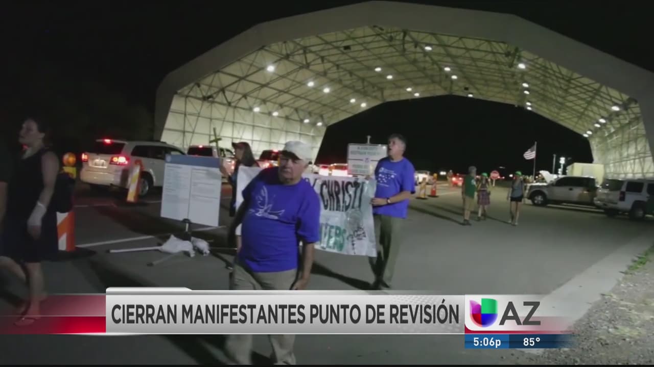Un grupo de manifestantes protestan en punto de revisión de la Patrulla Fronteriza