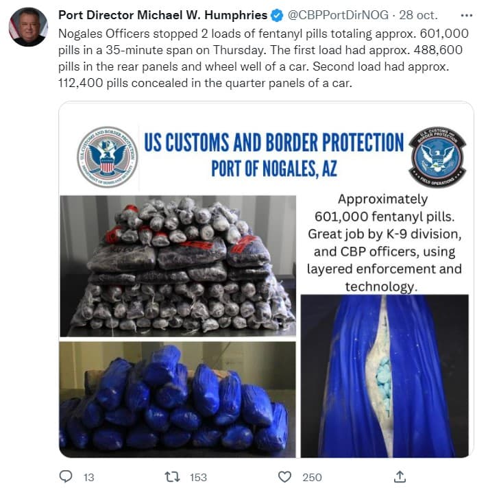 Michael Humphries, director de la Oficina de Operaciones del Puerto de Nogales, publicó imágenes en redes sociales con los cargamentos de drogas incautadas que iban a ingresar a Arizona desde territorio mexicano.