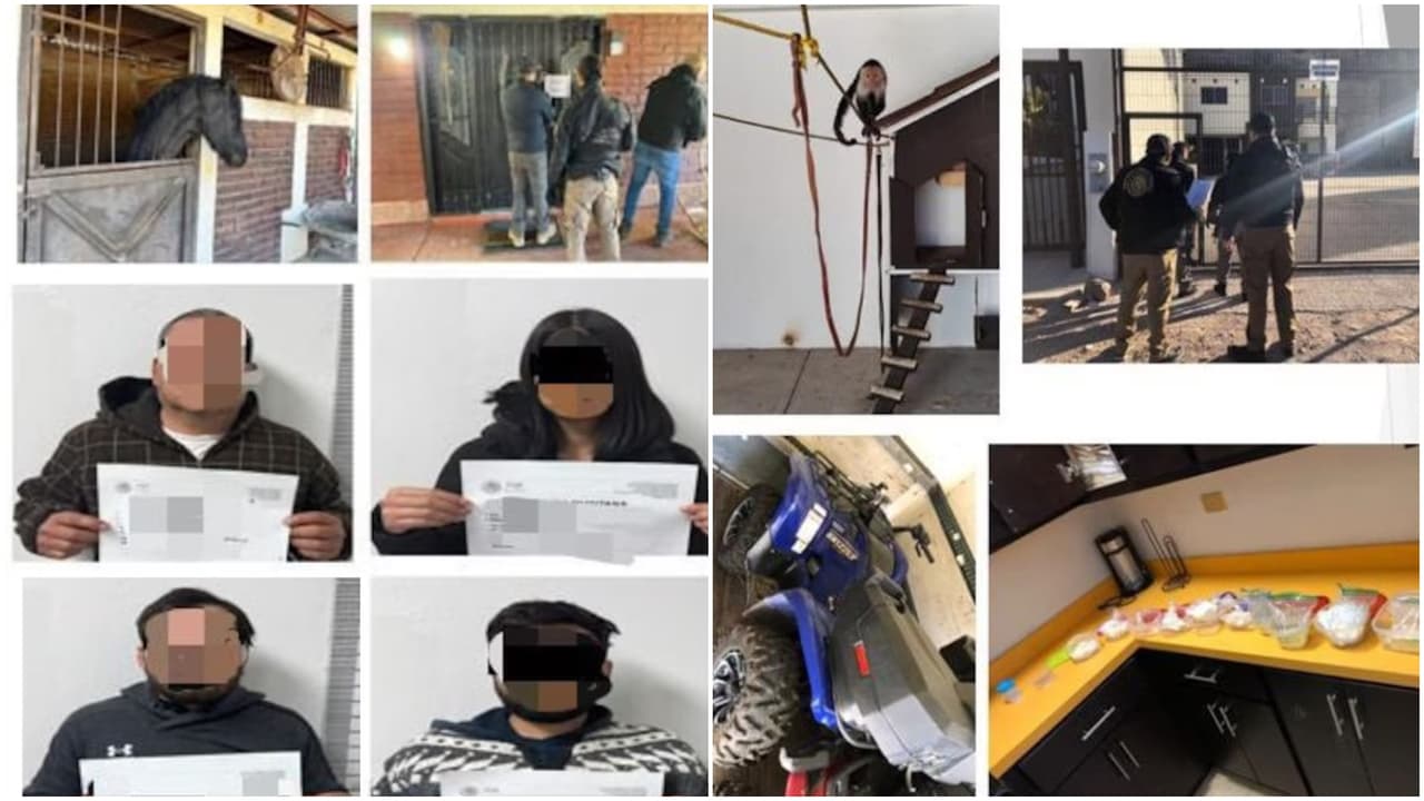 Cuatro personas fueron detenidas en Nogales, Sonora, en medio de una acción de cateo a un domicilio. En el lugar fueron hallados 19 caballos, un tigre, dos venados y seis vehículos. Los detenidos, así como los animales y las armas incautadas fueron puestas a disposición del Ministerio Público Federal.