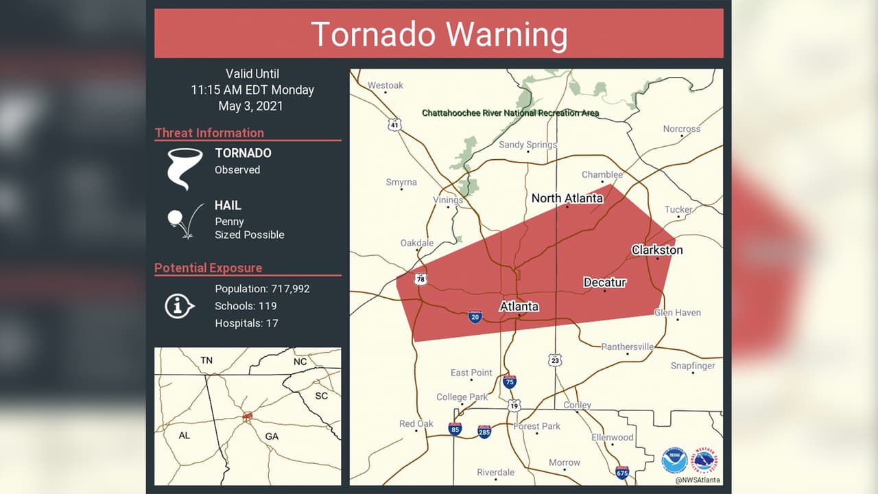 La advertencia continúa para Atlanta hasta las 11:15 am. Hay una alerta de tornado para un área más grande de Alabama y Georgia hasta las 4 pm.