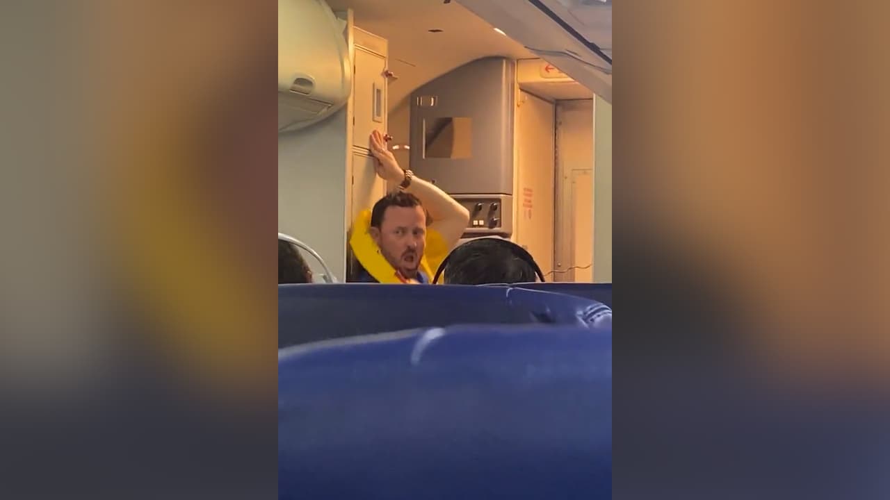 Los videos muestran al azafato haciendo poses con un chaleco salvavidas inflable mientras los pasajeros se ríen de lo que estaba ocurriendo.