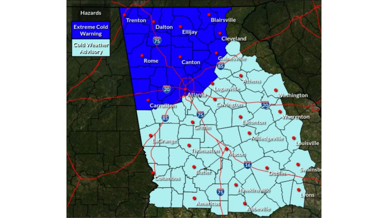 El Servicio Nacional de Meteorología emitió una advertencia por frío extremo en la mayor parte del norte de Georgia.