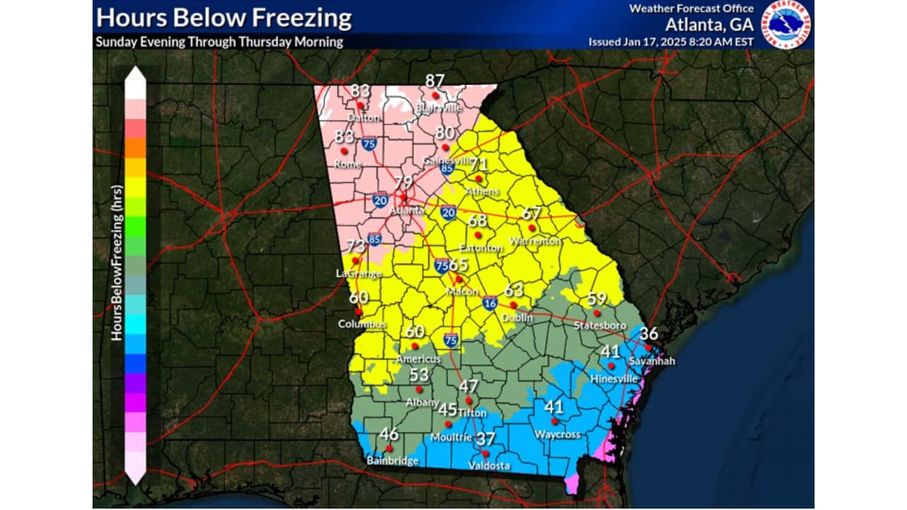 Condados en el norte y centro de Georgia pasarán más de 80 horas por debajo del punto de congelación esta semana. Esta es la lista de condados bajo alerta ante el frío extremo en el estado.