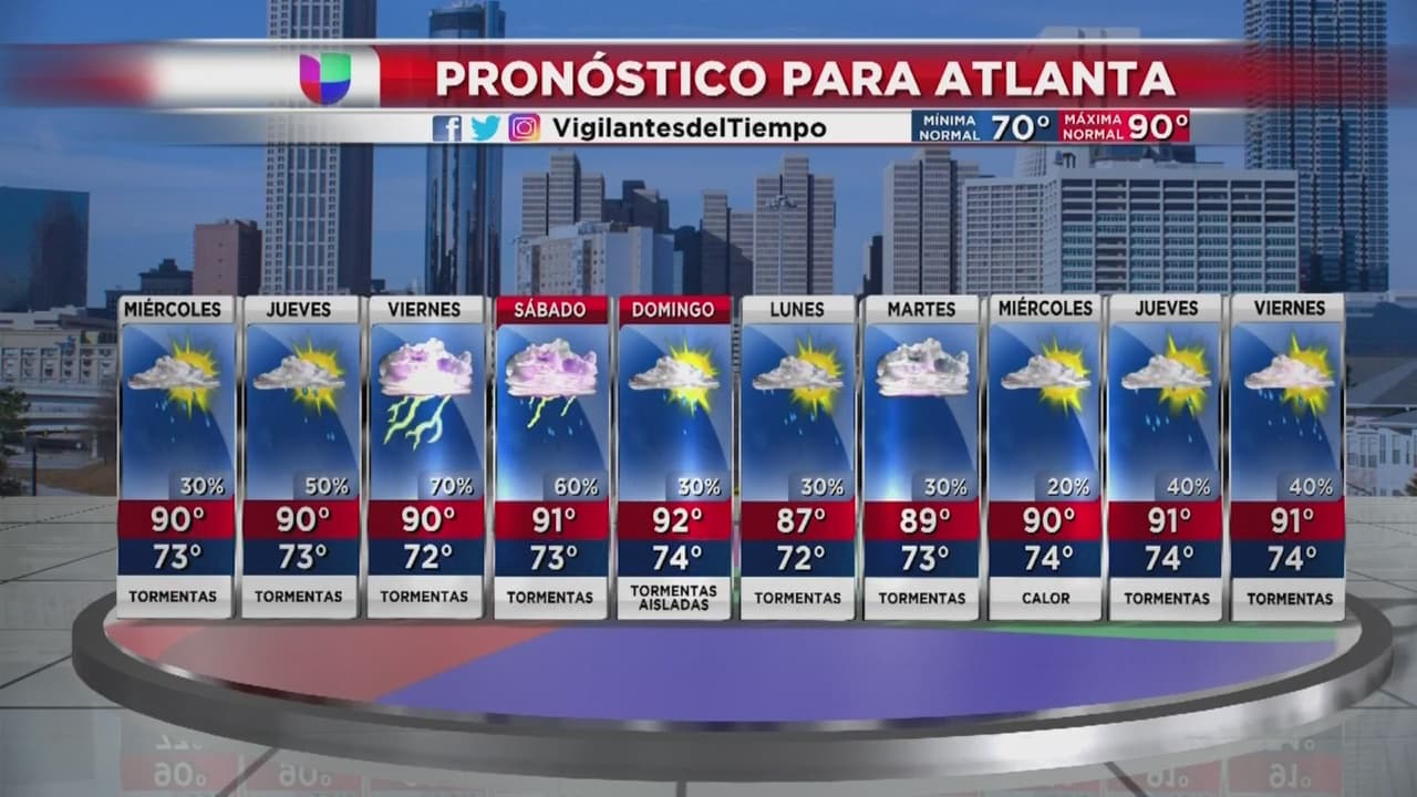 Este miércoles se presentará con tormentas aisladas en el área metropolitana de Atlanta y se pronostica que las probabilidades de lluvia incrementen entre jueves y viernes. Se espera que durante el fin de semana los chubascos se presenten en menor medida.