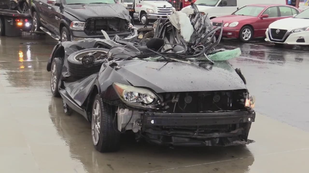 Camión se estrella, destroza varios autos y se vuelca en gasolinera de Norcross