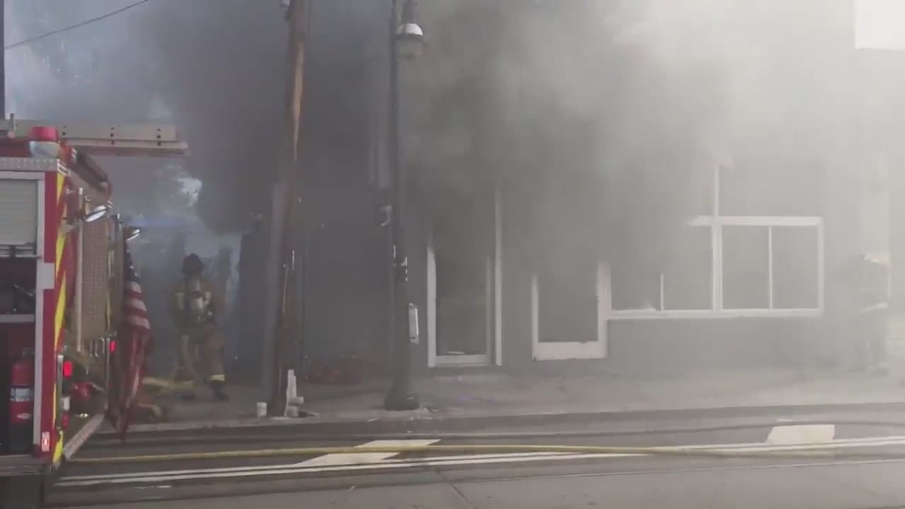 En las imágenes se observa como un bombero resultó herido al caer de una escalera de un segundo piso durante un incendio, el incidente ocurrió este lunes por la mañana.